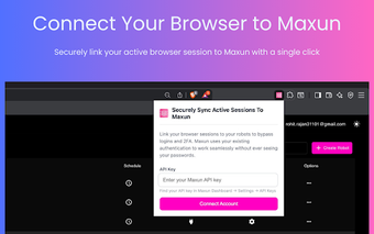 Maxun Session Sync es una extensión gratuita para Chrome que permite sincronizar de manera segura las sesiones activas del navegador con Maxun, facilitando la automatización sin necesidad de contraseñas. Esta herramienta se integra perfectamente con sesiones ya autenticadas, evitando la necesidad de repetir procesos de inicio de sesión y superando obstáculos de autenticación multifactor.